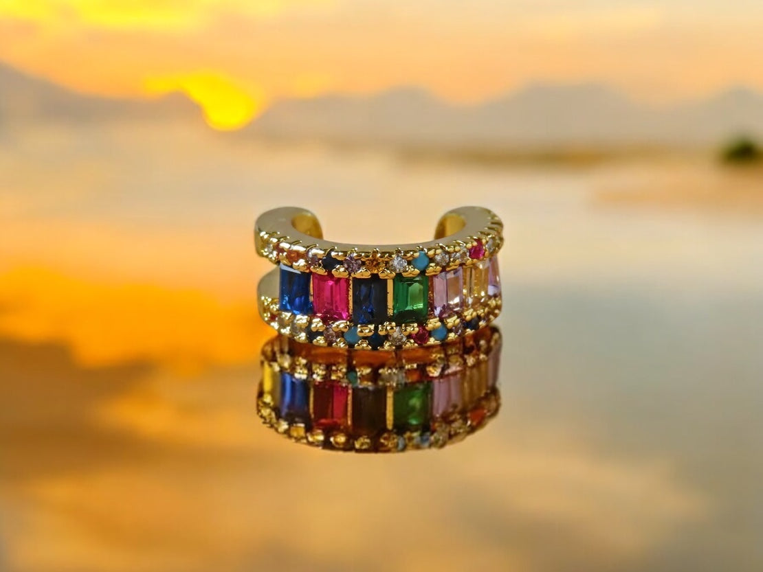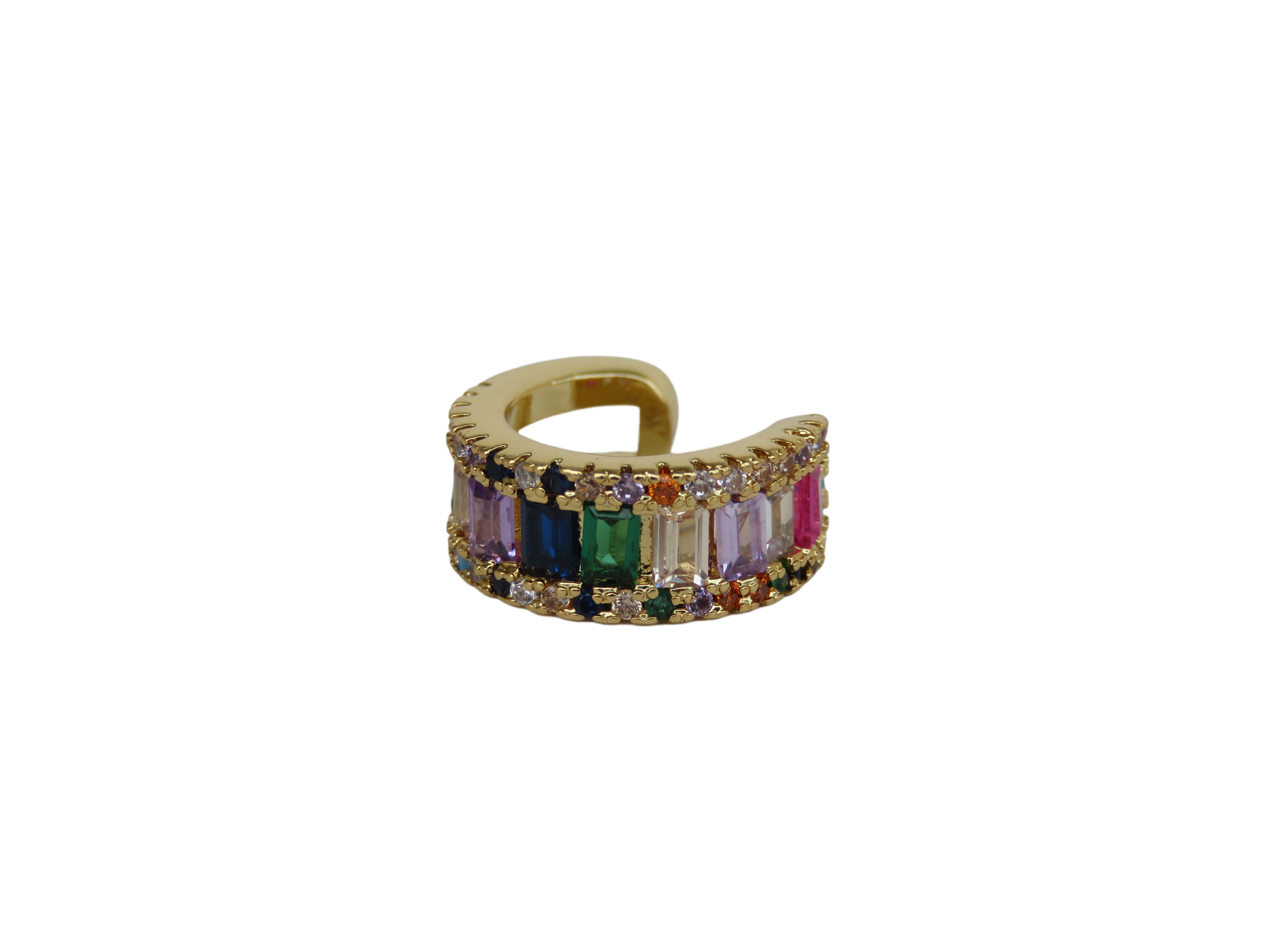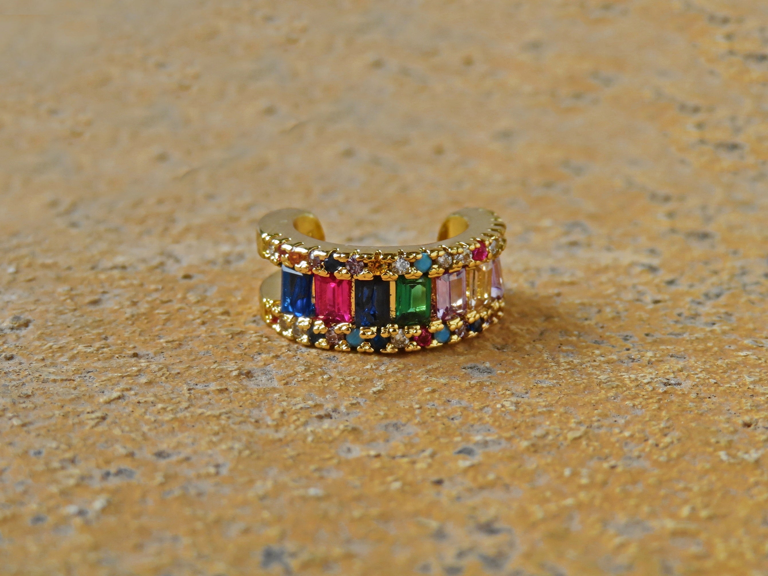 Pops of eclectic color form a joyful array of vivaciousness and contemporary style, allowing this ear cuff to draw attention with its stunning arrangement of shimmering hues. Wear this ear cuff on its own or pair it with hoops and studs for a unique, highly accessorized look.