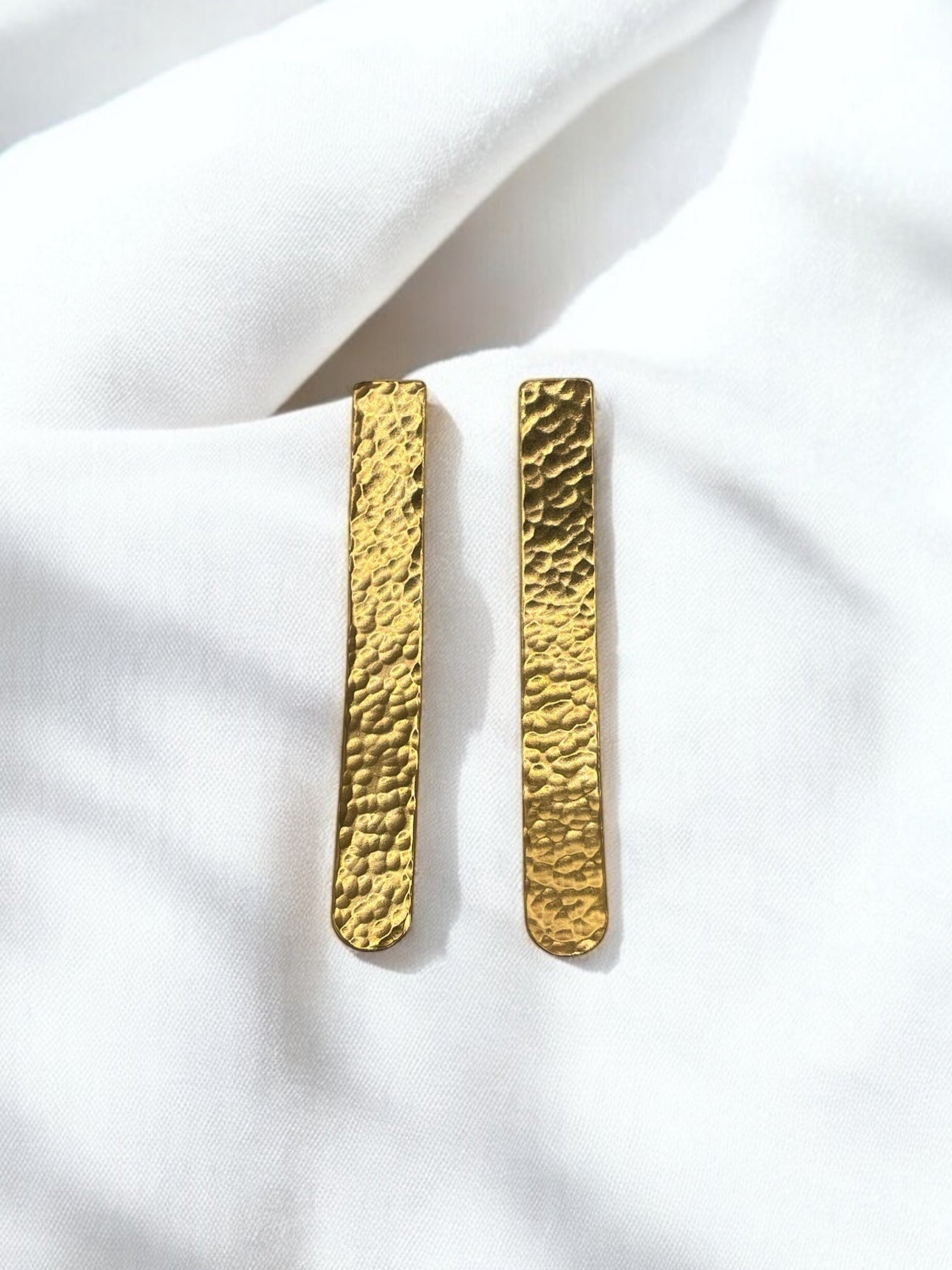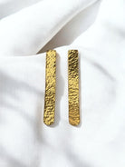 Introducing our exquisite handmade earrings, featuring two gold plated metal bars with a captivating curved shape. Crafted with precision, these earrings are made from high-quality brass and meticulously hammered to create a unique texture. The gold plating adds a touch of elegance, making them a perfect accessory for any occasion. Elevate your style with these stunning, one-of-a-kind pieces of handmade jewellery.