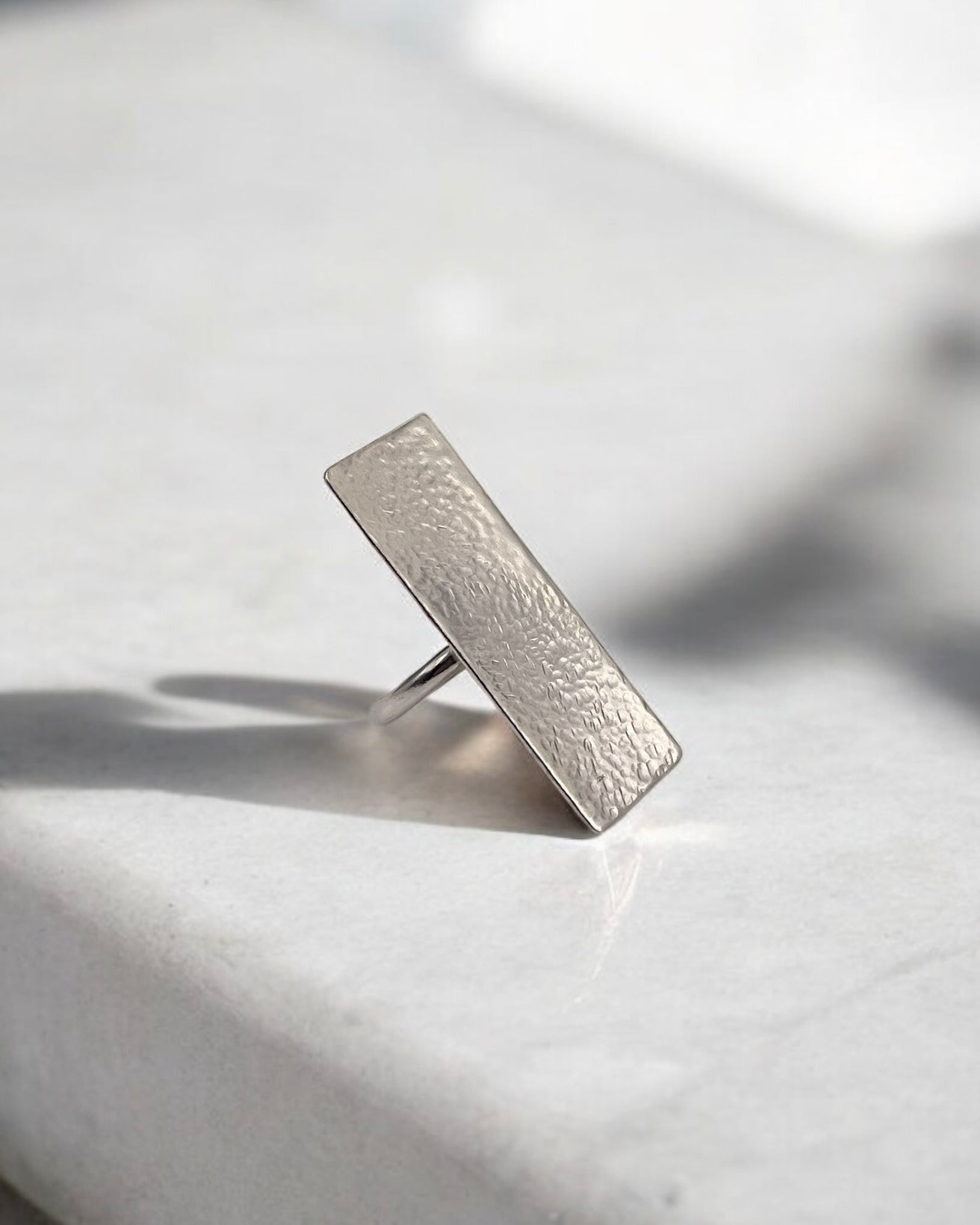 This exquisite silver ring is a true statement piece, featuring a unique hammered design that adds a touch of elegance to any outfit. Handmade with care, this adjustable ring is perfect for those who appreciate quality craftsmanship and attention to detail. The sleek and modern design makes it a versatile accessory that can be worn for any occasion, making it a must-have addition to any jewelry collection.