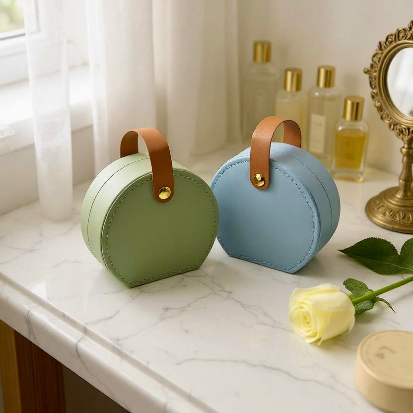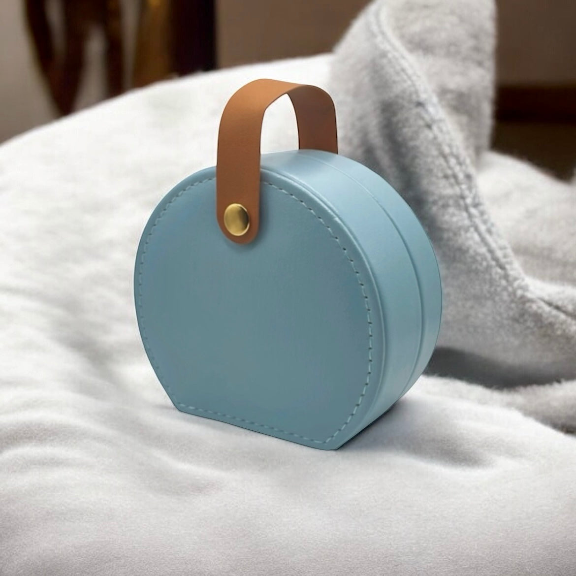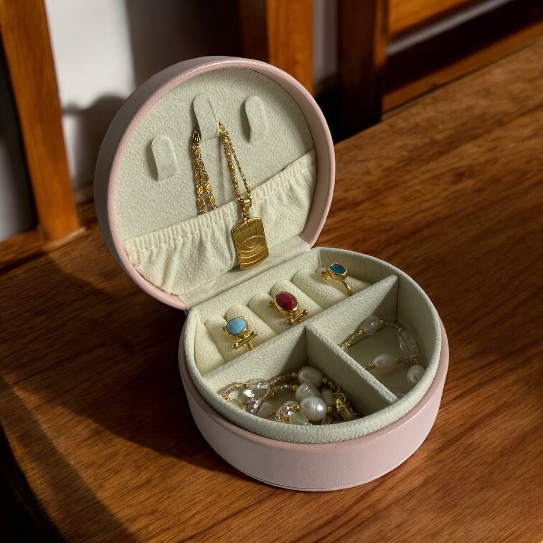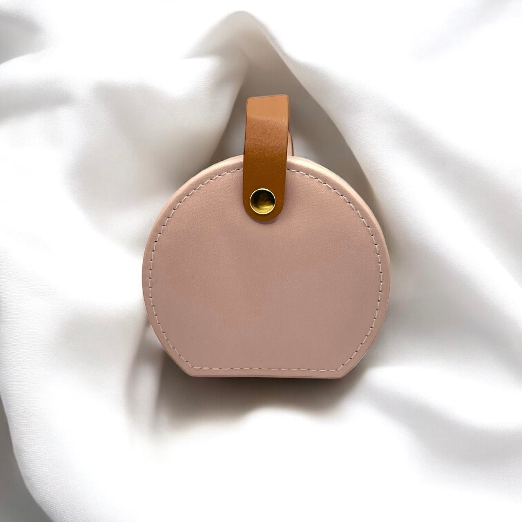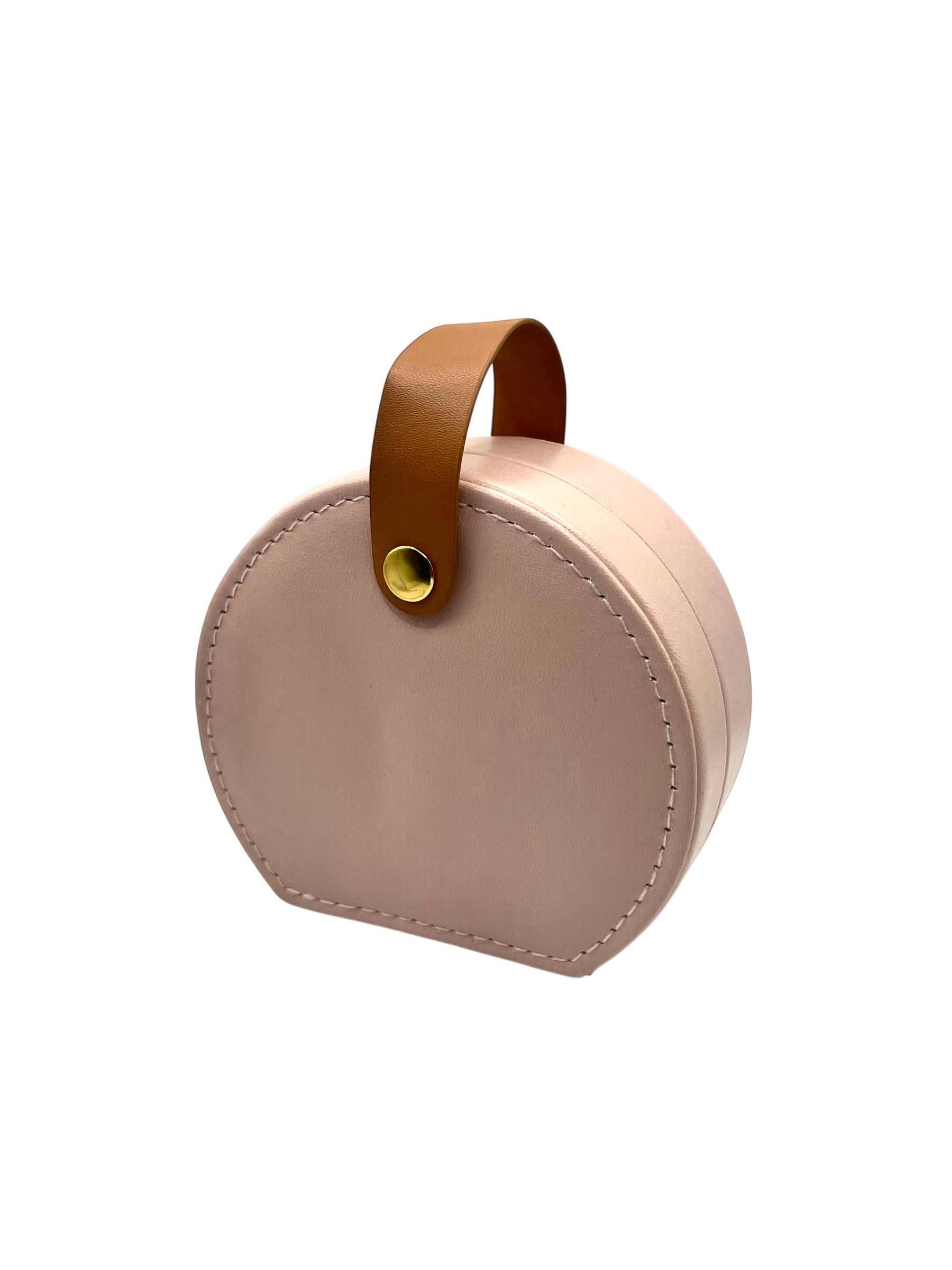 Keep your favorite pieces safe, stylish, and always within reach. Our new round-shaped jewelry box is the perfect blend of form and function crafted in soft pastel hues with a smooth vegan leather finish, accented by a luxe tan strap and gold hardware. Whether you're storing your treasures at home or taking them on your travels, this compact yet spacious box keeps your jewelry organized, protected, and beautifully displayed.
