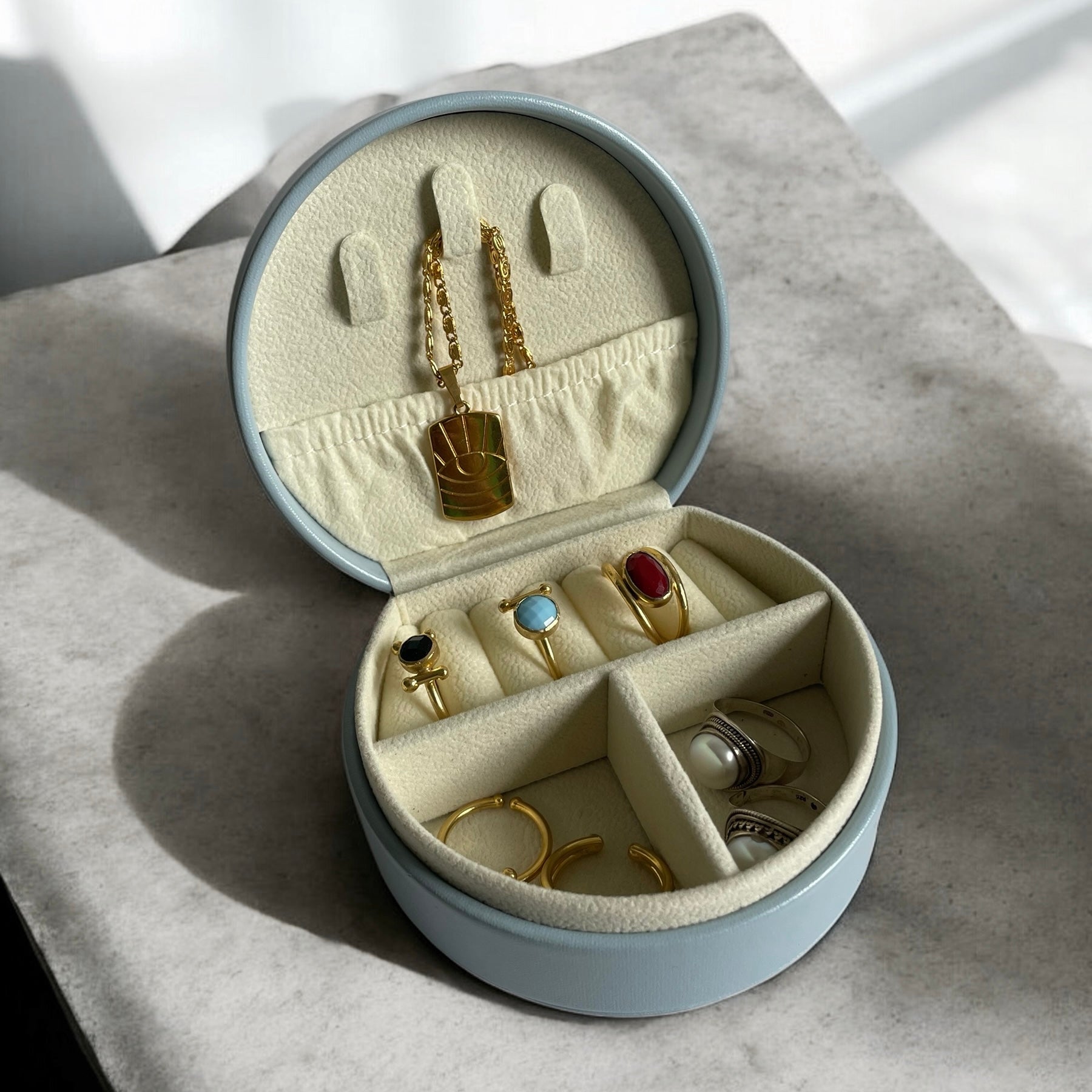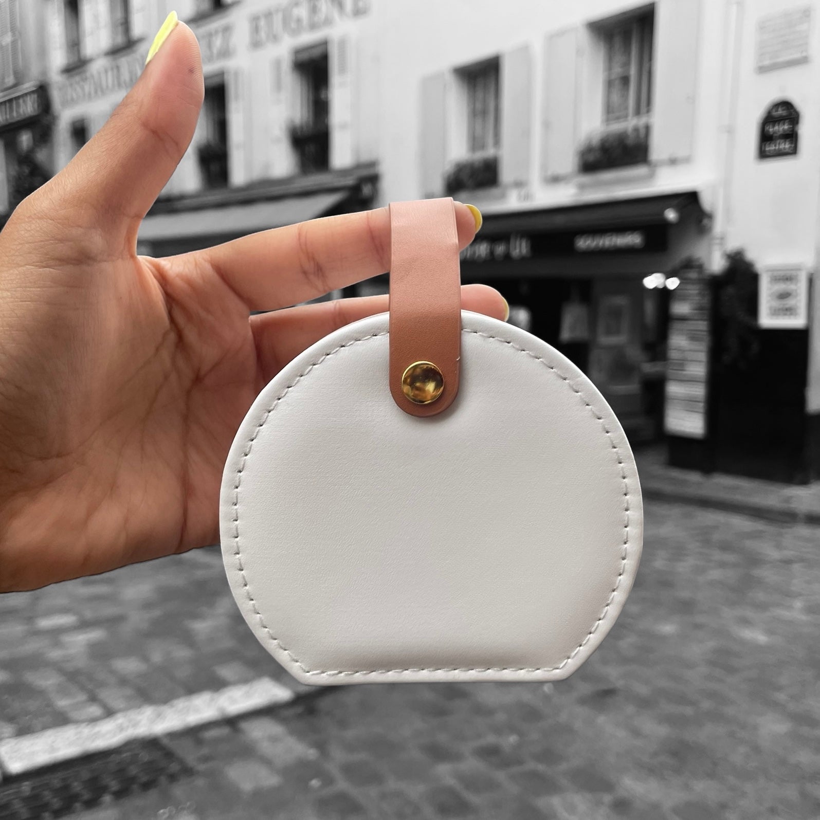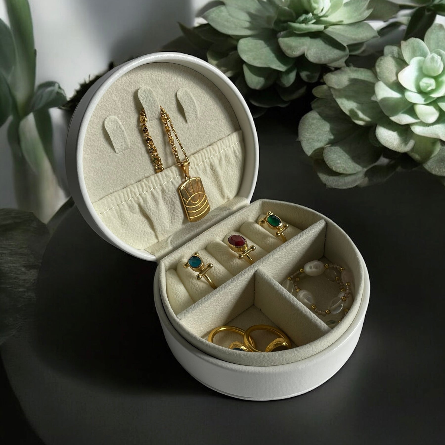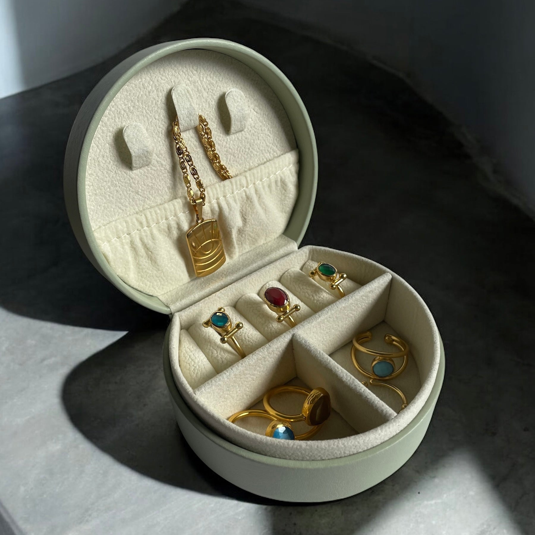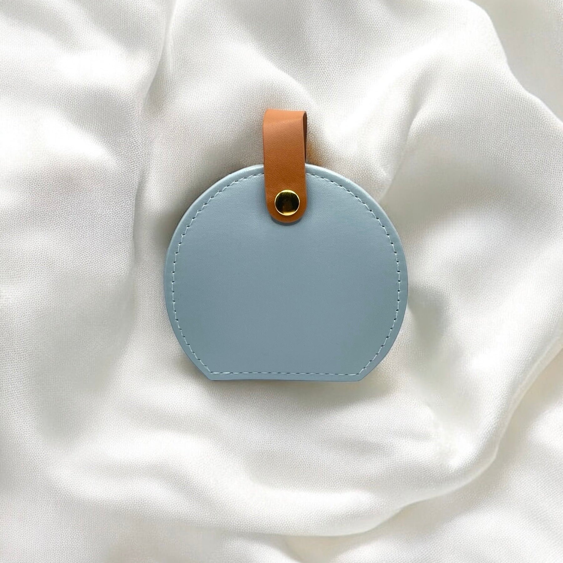 Keep your favorite pieces safe, stylish, and always within reach. Our new round-shaped jewelry box is the perfect blend of form and function crafted in soft pastel hues with a smooth vegan leather finish, accented by a luxe tan strap and gold hardware. Whether you're storing your treasures at home or taking them on your travels, this compact yet spacious box keeps your jewelry organized, protected, and beautifully displayed.