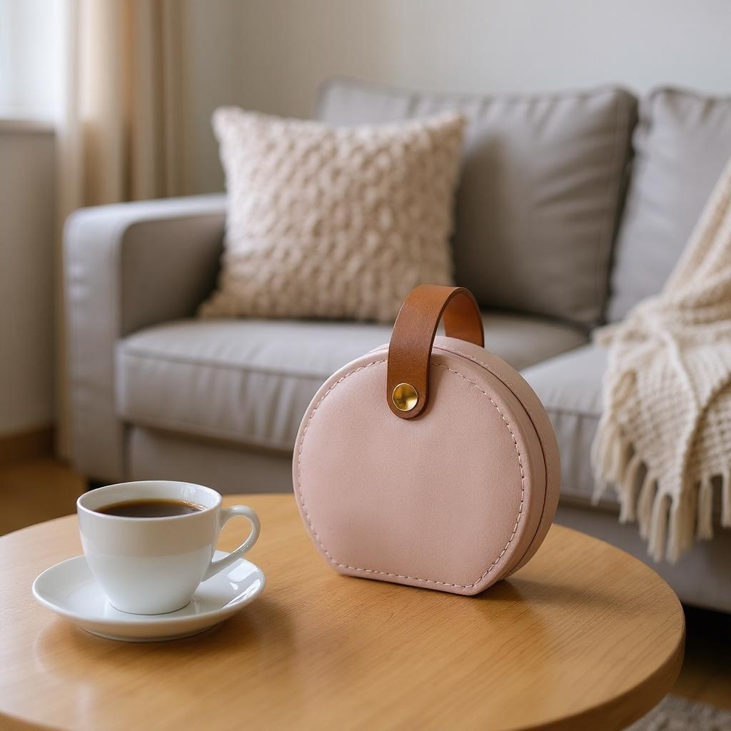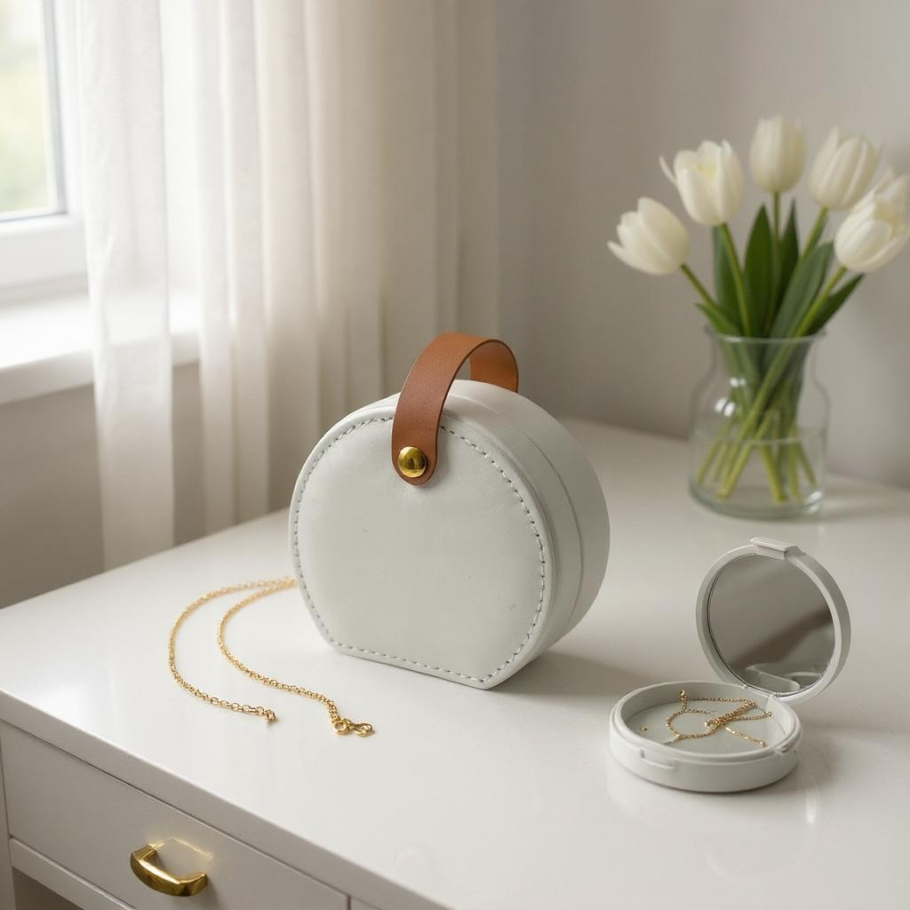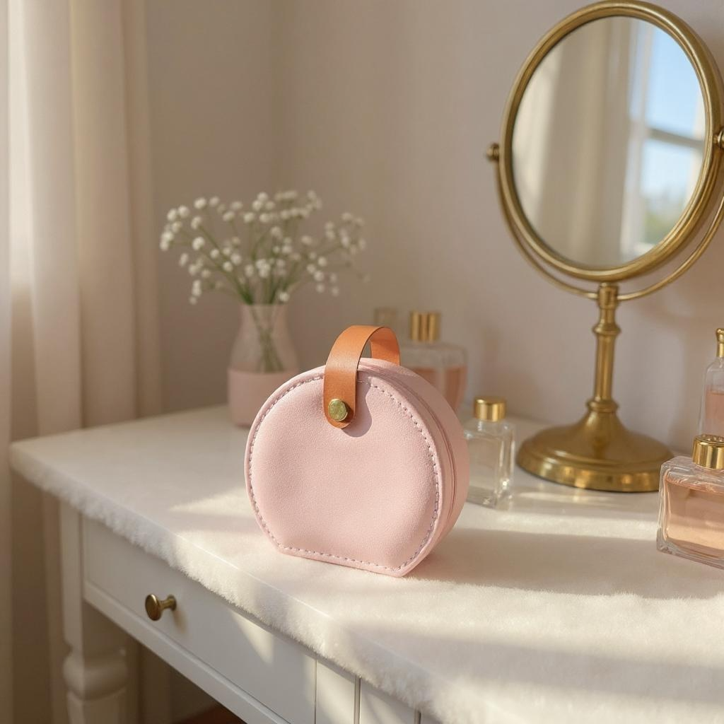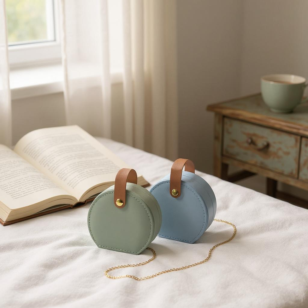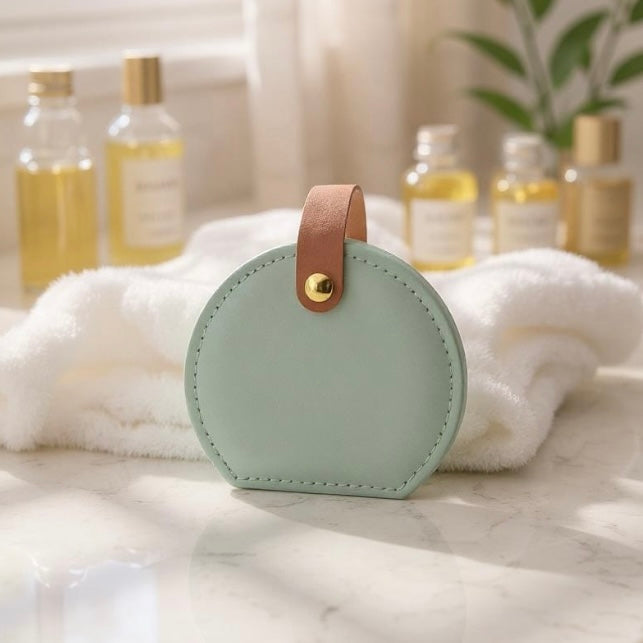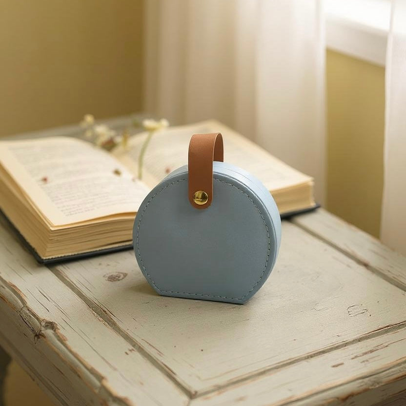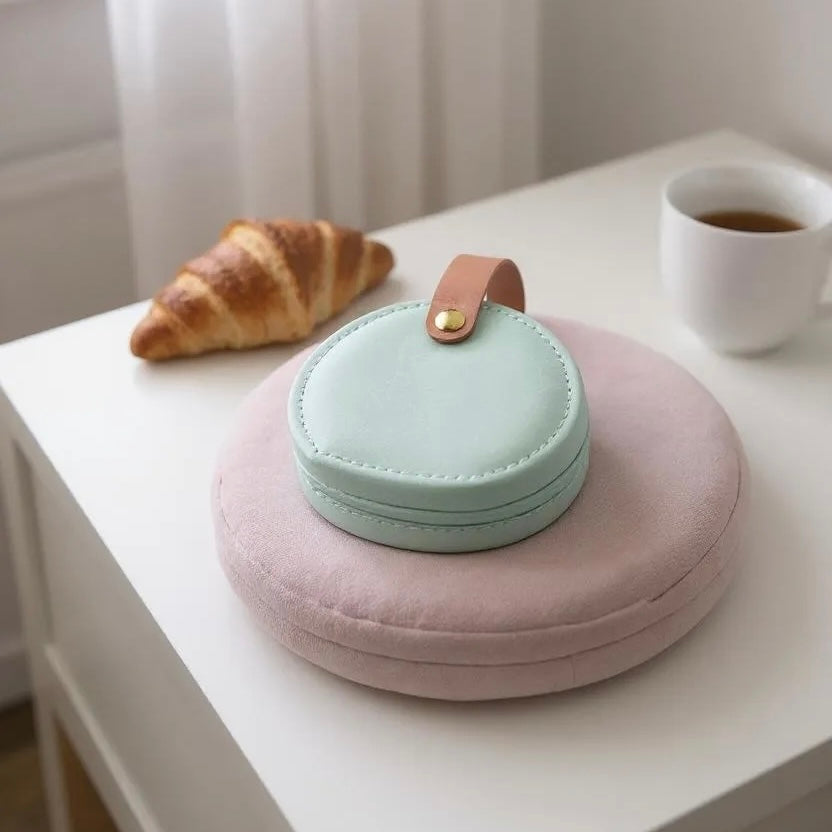 Keep your favorite pieces safe, stylish, and always within reach. Our new round-shaped jewelry box is the perfect blend of form and function crafted in soft pastel hues with a smooth vegan leather finish, accented by a luxe tan strap and gold hardware. Whether you're storing your treasures at home or taking them on your travels, this compact yet spacious box keeps your jewelry organized, protected, and beautifully displayed.