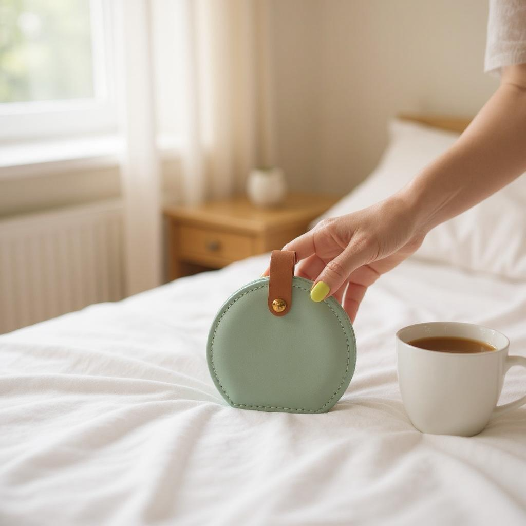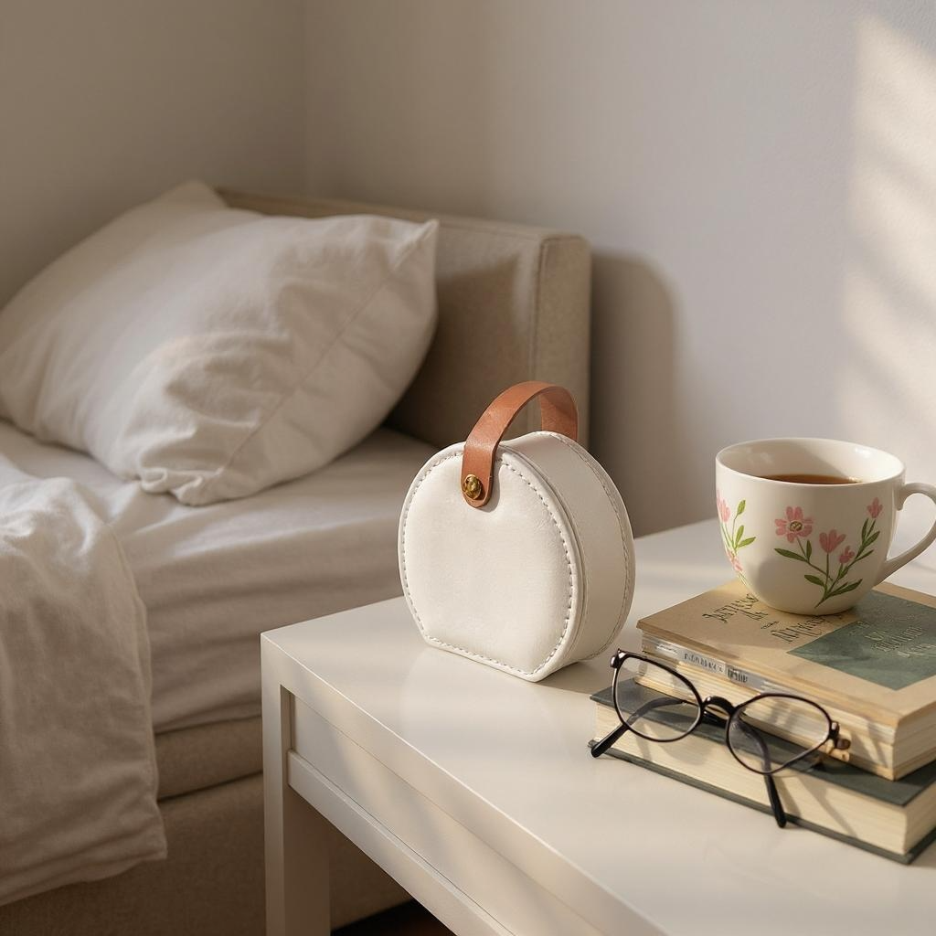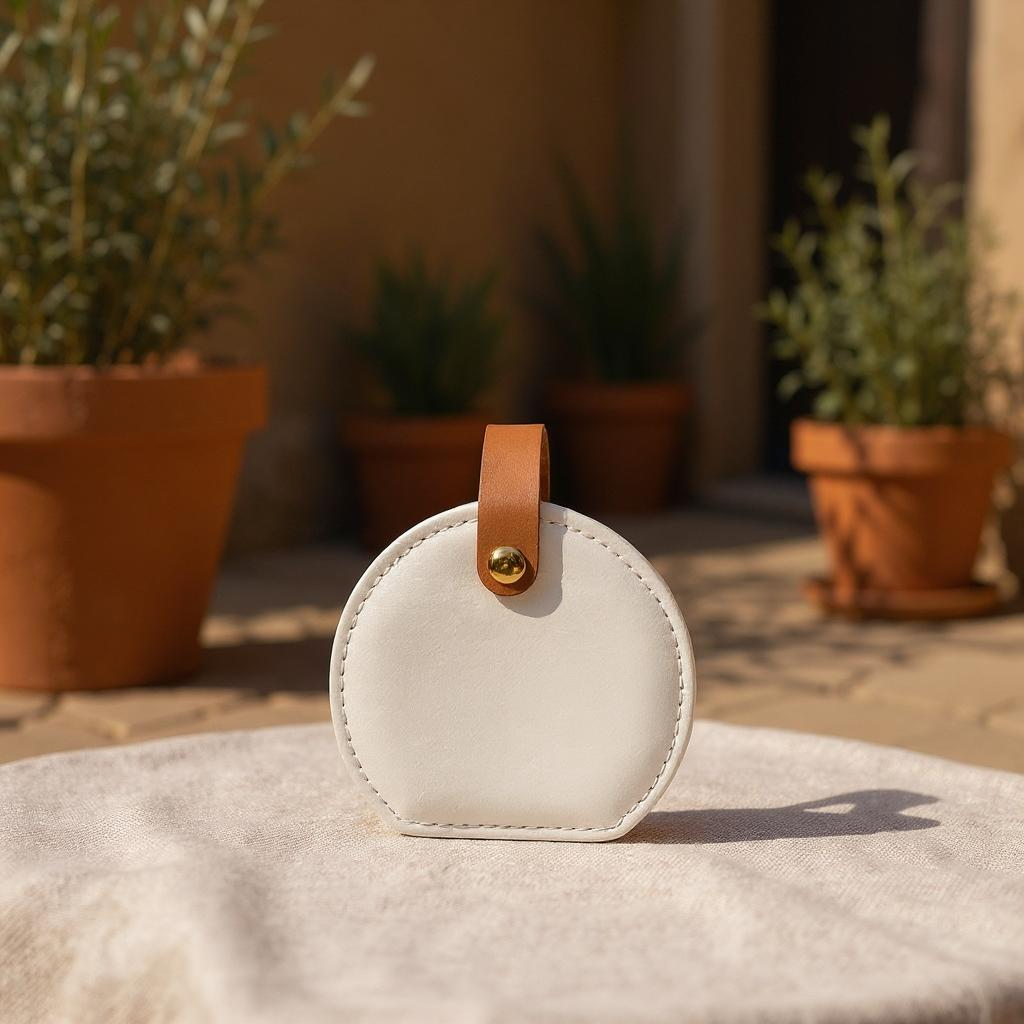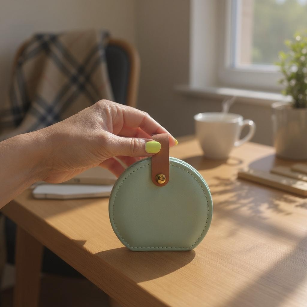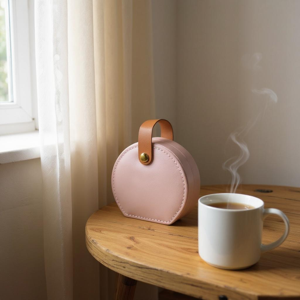 Keep your favorite pieces safe, stylish, and always within reach. Our new round-shaped jewelry box is the perfect blend of form and function crafted in soft pastel hues with a smooth vegan leather finish, accented by a luxe tan strap and gold hardware. Whether you're storing your treasures at home or taking them on your travels, this compact yet spacious box keeps your jewelry organized, protected, and beautifully displayed.