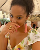 Add a touch of elegance and a splash of color to your ensemble with our Flamingo fringe earrings. These eye-catching accessories feature luxurious pink fringe that gracefully dangles, creating movement and intrigue with every step. The fringe is complemented by a sophisticated gold shell, adding a chic and refined touch to the design.