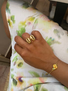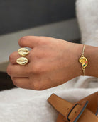 Experience coastal elegance with our Gold-Plated Double Cowrie Ring. Handcrafted to perfection, it features two delicately detailed cowrie shells, symbolizing prosperity and protection. With an adjustable design for a comfortable fit, elevate your ensemble with natural charm and sophistication.