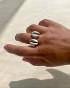 Experience coastal elegance with our silver Double Cowrie Ring. Handcrafted to perfection, it features two delicately detailed cowrie shells, symbolizing prosperity and protection. With an adjustable design for a comfortable fit, elevate your ensemble with natural charm and sophistication.